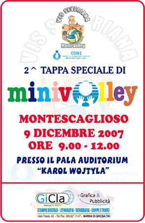Seconda tappa speciale di MINIVOLLEY Creato da Cambiamo Cultura Data:07 Dicembre 2007 in: Sport Lascia un Commento 1087 Visualizzazioni Invito a tutti i bambini/e dai 6 ai 12 anni, che vogliono partecipare attivamente alla manifestazione sportiva e a tutti i genitori.