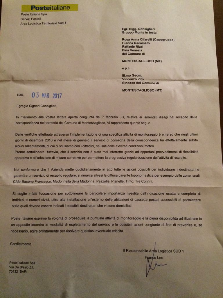 Lettera inviata a Poste italiane in data 7/02/2016 https://www.montescaglioso.net/node/28285
