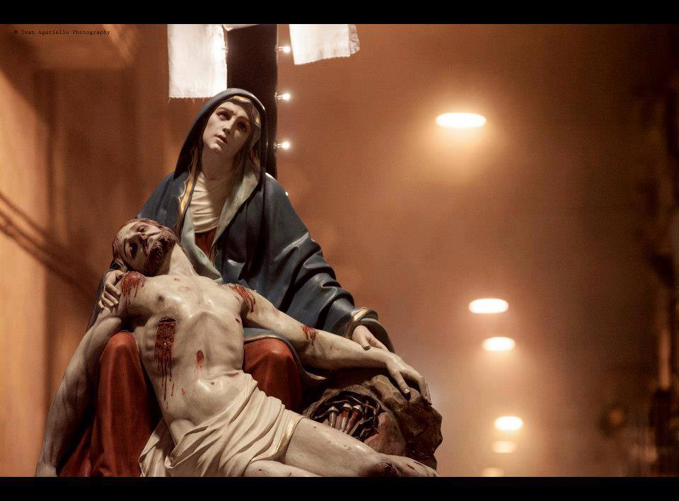 soccorso dalla Veronica; incoronato Re con la canna tra le mani; crocifisso; disteso morto; tra le braccia della Pietà. Chiude l’Addolorata seguita dalla celebre banda di Montescaglioso che intona solo marce funebri. La processione attraversa a passo lentissimo e dondolante le strade della città fermandosi in tutte le chiese.
