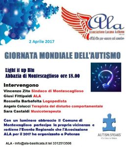 In occasione della Giornata Mondiale dell’Autismo in programma per la giornata di domenica 2 aprile, l’Amministrazione Comunale in collaborazione con l’Associazione A.L.A. Onlus (Associazione Lucana Autismo) ha organizzato un convegno presso l’Abbazia di San Michele Arcangelo alle ore 18.00. Interverranno il Sindaco Vincenzo Zito, la socia A.L.A. Giusi Fittipaldi, la logopedista Rossella Barbafolta, il terapista del disturbo comportamentale Angelo Colucci e la musicoterapeuta Sara Castaldi. A fine convegno il primo chiostro dell’Abbazia sarà illuminato di blu, il colore che le Nazioni Unite hanno voluto associare a questa giornata. L’obiettivo degli organizzatori è che tale manifestazione non si fermi a domenica ma che, attraverso di essa, si pongano le basi per un serio investimento socio-assistenziale verso questi ragazzi speciali.