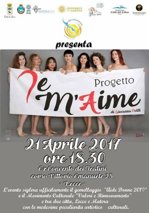 Una delegazione materana costituita dall’Associazione A.I.D.E. , dal Consiglio Donne2019, dal sindaco di Matera Raffaello De Ruggieri e dall’assessore con delega ai Sassi e al Patrimonio Unesco Paola D’Antonio, venerdì 21 aprile alle ore 18:30, sarà presente a Lecce in occasione della presentazione del Progetto “Je m’aime” ideato dalla scrittrice e poetessa salentina Giovanna Politi insieme al Movimento culturale Valori e Rinnovamento e all’associazione Culturale del Sole de delle ali azzurre. La finalità del progetto è quella di contrastare ogni forma di violenza educando alla bellezza, all’arte, al bene comune, rafforzando l’autostima e il rispetto per se stessi e gli altri. La poesia di Giovanna Politi, già testimonial di Donne2019, incontrerà l’arte di Ilaria Del Monte Donna2019 ed affermata pittrice lucana. La location scelta è il magnifico ex convento dei Teatini in corso Vittorio Emanuele a Lecce. L’iniziativa, consoliderà il gemellaggio siglato tra il Movimento Culturale Valori e Rinnovamento guidato dal Prof. Wojtek Pankiewicz e l’Associazione A.I.D.E. Donne2019.