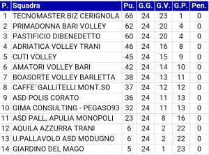 La Vis Severiana Caffe’ Gallitelli espugna di forza il parquet del Monopoli e torna prepotentemente in zona salvezza. Una vittoria netta e lampante quella ottenuta dalle ragazze di Dino Esposito, che si sono imposte col punteggio di 3-0, con parziali 22-25, 13-25, 24-26. Risultato mai in discussione, anche se nel primo set c’e’ stata battaglia, con Andrea De Moraes e compagne solo nel finale sono riuscite a spuntarle e a piazzare l’acuto vincente. Tutto facile anche nel secondo parziale, quando la battuta ficcante delle montesi ha mandato in tilt la ricezione delle padrone di casa, costrette ad arrendersi 25-13. La reazione d’orgoglio delle pugliesi c’e’ stata nel terzo set, complice anche un leggero calo fisico delle biancazzurre, che avevano speso tanto nei primi due parziali. Si e’ cosi’ assistito ad un punto a punto fino ai vantaggi, con la Vis Severiana anche in questa circostanza piu’ lucida e determinata al rush finale. Le ragazze di mister Esposito grazie a questa vittoria, si riprendono l’ottava posizione in classifica, sorpassando nuovamente il Corato, sconfitto a sorpresa a Molfetta. Quando mancano due giornate dalla fine, le montesi dovranno conservare un punto sul sestetto coratino, e magari tentare di mettere alle spalle anche il Barletta, a sua volta anch’ esso sconfitto in casa dal Trani e attualmente al settimo posto con appena un punto di vantaggio sulla squadra del presidente Vittorio Di Grazio. Certo, il calendario non e’ certo dalla parte delle biancazzurre, che nel penultimo turno affronteranno il Cuti Volley e in chiusura se la vedranno con l’Altamura, squadre che occupano rispettivamente la quinta e terza posizione, mentre le rivali per la salvezza affronteranno sfide certamente piu’ agevoli: ma il sestetto visto all’ opera a Monopoli puo’ portare a casa dei punti preziosi che consentirebbero di evitare la bagarre dei playout e festeggiare la permanenza alla fine della stagione regolare, rispettando cosi’ l’ obiettivo iniziale.