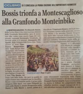 Ferdinando Bossis, della Cyclon Store.it ha vinto la prima edizione della Granfondo Monteinbike, gara di mountain bike valida come quarta tappa del campionato regionale Bicinpuglia Granfondo. Al secondo posto si e’ piazzato Alessandro Fittipaldi, della Ciclisport2000 Focus Bike Team, mentre al terzo Gianfranco Bongermino, della Team Murgia Bike Santeramo. Alla Kermesse delle ” ruote grasse ” disputata a Montescaglioso e organizzata dall’ Asd Nuova Athena Club del presidente Antonio Soranno, hanno partecipato circa 170 corridori provenienti da varie regioni d’ Italia, in gran parte dalla Puglia, in realta’, il primo a tagliare il traguardo e’ stato Vito Buono, del Team Nob Selle Italia, che pero’ in qualita’ di ospite d’onore non competeva per la classifica. Bossis ovviamente e0 stato ovviamente il primo nella categoria Elite Sport, cosi come Fittipaldi ha vinto nella master 4, mentre Bongermino nella master 2. Nella master 1, invece, primo si e’ classificato Vitoantonio Bianco, dell’ Asd Amatori Putignano ( quinto nella generale), mentre nella master 3 ha prevalso Donato Dragone della Sport Bike Lucania,( dodicesimo in classifica generale ), e nella master 5 Augusto Cofano dell’ Asd Ciclistica Vernolese ( sestonella generale). Giuseppe Pagliaruolo, dell’ Amatori Putignano, si e’ affermato nella Master 6 ( ottantaduesimo nella classifica generale ) e Cristian Roberti, tesserato per la Black Lions Mtb Statte, nella Allievi (novantesimo a livello generale). Tra le donne,invece,prima e giunta Patrizia Tropiano, portacolori Rioneroo il velocifero , che si e’ piazzata in classifica generale al centonovesimo posto. Piu’ in generale, la gara e’ stata ottimamente organizzata dalla Nuova Athena Club di Soranno e del direttore tecnico Pasquale Santarcangelo: il percorso ha messo in mostra le bellezze del comprensorio della cittadina montese, sempre consapevole di essere attrattore turistico di prim’ordine.