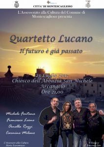 A concludere l’ampia offerta culturale proposta durante il weekend, domenica 23 luglio alle ore 21.00 presso l’Abbazia di San Michele Arcangelo si esibirà il “Quartetto Lucano”. Il sodalizio propone al suo pubblico il repertorio popolare della propria terra, elaborato sotto una veste moderna, con ritmi ed armonie inedite. Il gruppo è attualmente formato dai musicisti Michele Fontana, Carmine Milano, Ornella Ruzzi, Francesco Leone, impegnati didatticamente nelle Istituzioni Musicali Statali e svolge, inoltre, un’ intensa attività concertistica riscontrando larghi consensi di pubblico e critica.