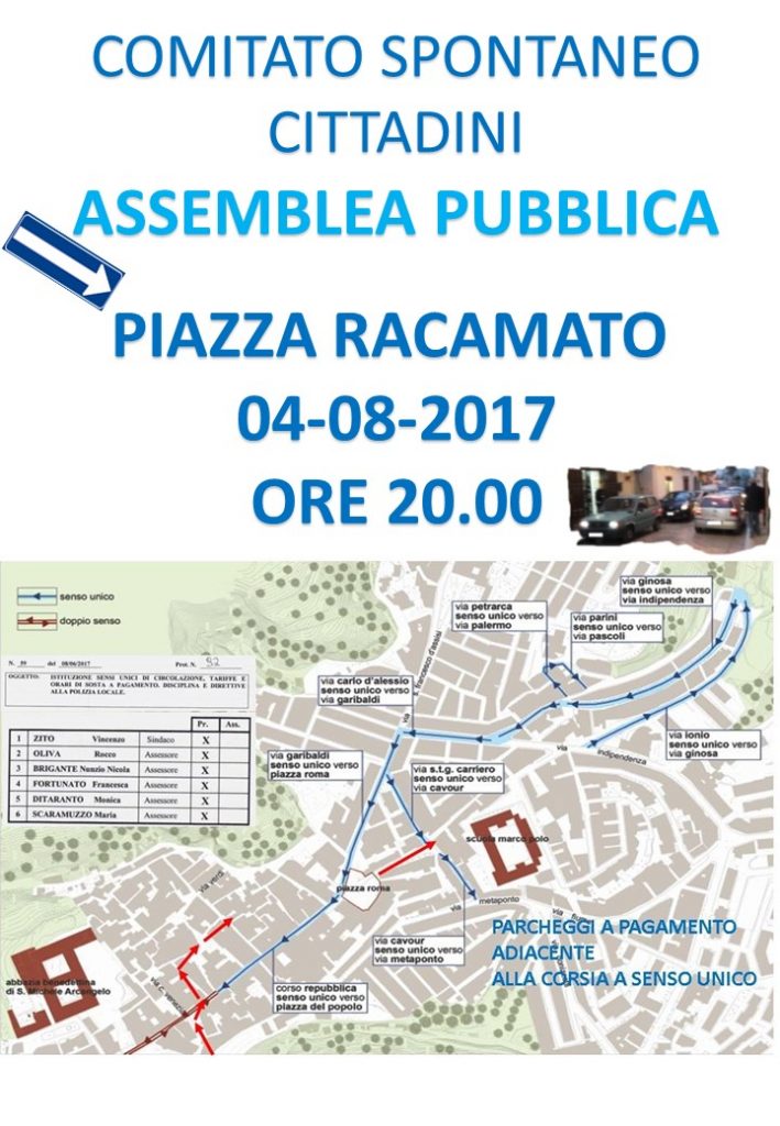 il comitato spontaneo cittadino vi da appuntamento domani 04/08/2017 a Piazza Racamato ore 20.00 per un assemblea pubblica per discutere e decidere insieme il da farsi. l’obbiettivo mille firme è stato abbondandemente superato