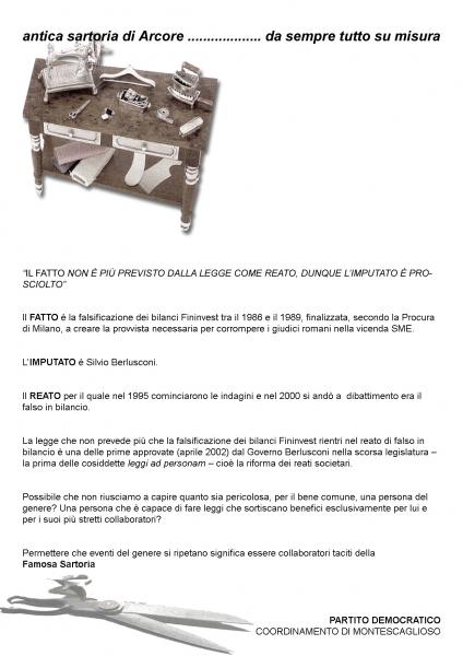 mi risulta che tra i più illustri clienti dell’antica sartoria, ci sia stato anche tale prof. Prodi,il quale, approfittando di un altro “abito su misura”, si affrettò a fare la donazione ai propri figli, risparmiando un bel gruzzoletto di euro sulle tasse di successione. Per quel che riguarda il falso in bilancio, non mi risulta che imprenditori di sinistra abbiano fatto barricate,perchè la legge veniva da quel pulpito! Per stare più nel nostro piccolo, proporrei qualche domandina: