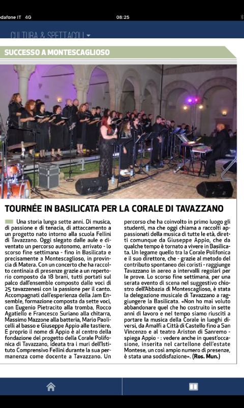Una esperienza grandiosa a Montescaglioso(Matera).Un concerto di 18 pezzi arrangiati dal maestro Giuseppe Appio che hanno allietato le centinaia di persone arrivate in una location suggestiva e cioè la Abbazia di San Michele .Luci,suoni e colori hanno contribuito a rendere la serata unica nel suo genere e hanno portato, assieme ad un po di ansia, un concentrato di voci e musica e consensi da parte del pubblico presente.Grazie a tutti.