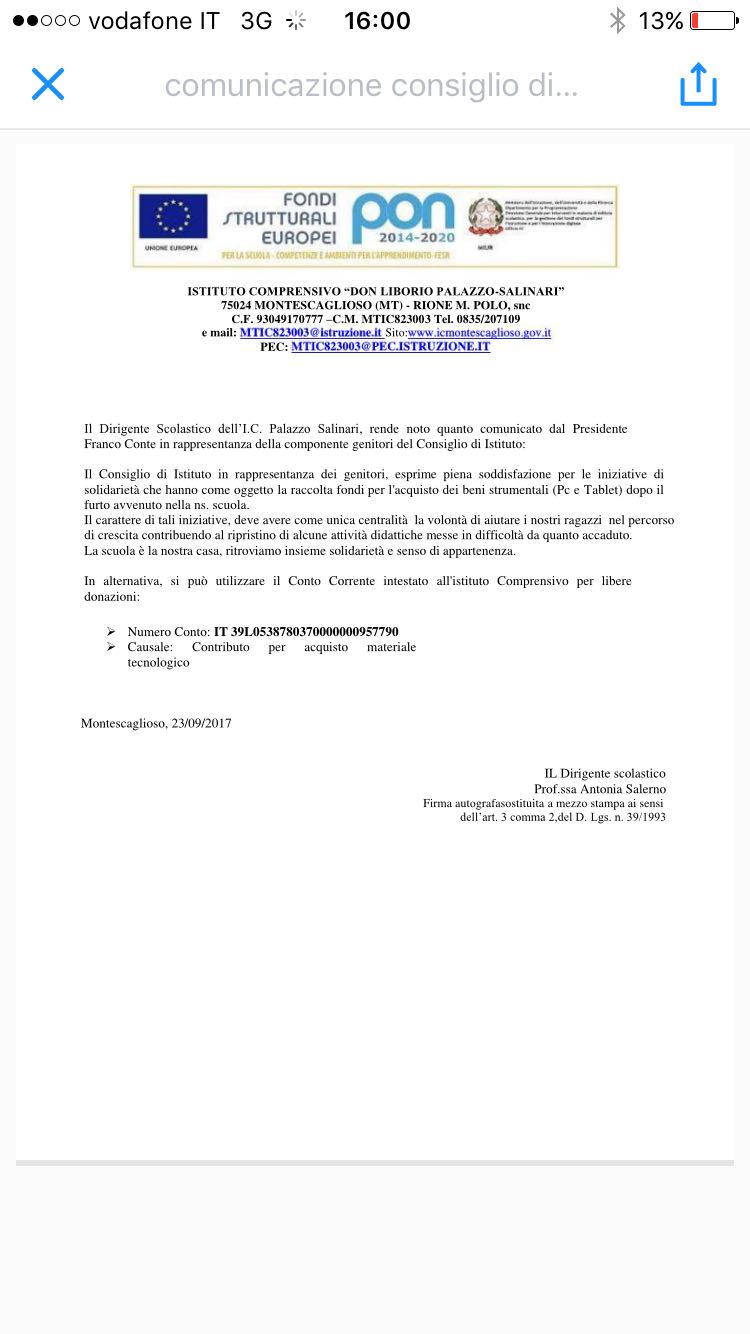 Il Consiglio di Istituto in rappresentanza dei genitori, esprime piena soddisfazione per le iniziative di solidarietà che hanno come oggetto la raccolta fondi per l’acquisto dei beni strumentali (Pc e Tablet) dopo il furto avvenuto nella ns. scuola.