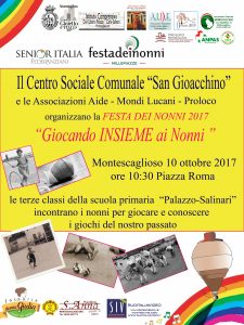 Nell’ambito dell’iniziativa “Festa dei Nonni – Mille Piazze 2017” della Senior Italia FederAnziani nazionale, nella mattinata del 10 ottobre prossimo gli alunni delle terze classi della primaria dell’Istituto Comprensivo Palazzo-Salinari , incontreranno i “nonni” del Centro Sociale Comunale “San Gioacchino” di Montescaglioso e delle Associazioni A.I.D.E., Mondi Lucani e Pro loco che hanno aderito alla Festa dei nonni 2017.