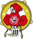 Il folletto vestito di rosso rappresenta infatti questo personaggio favoloso, il tamburello d’oro e la partitura simboleggiano la musica.