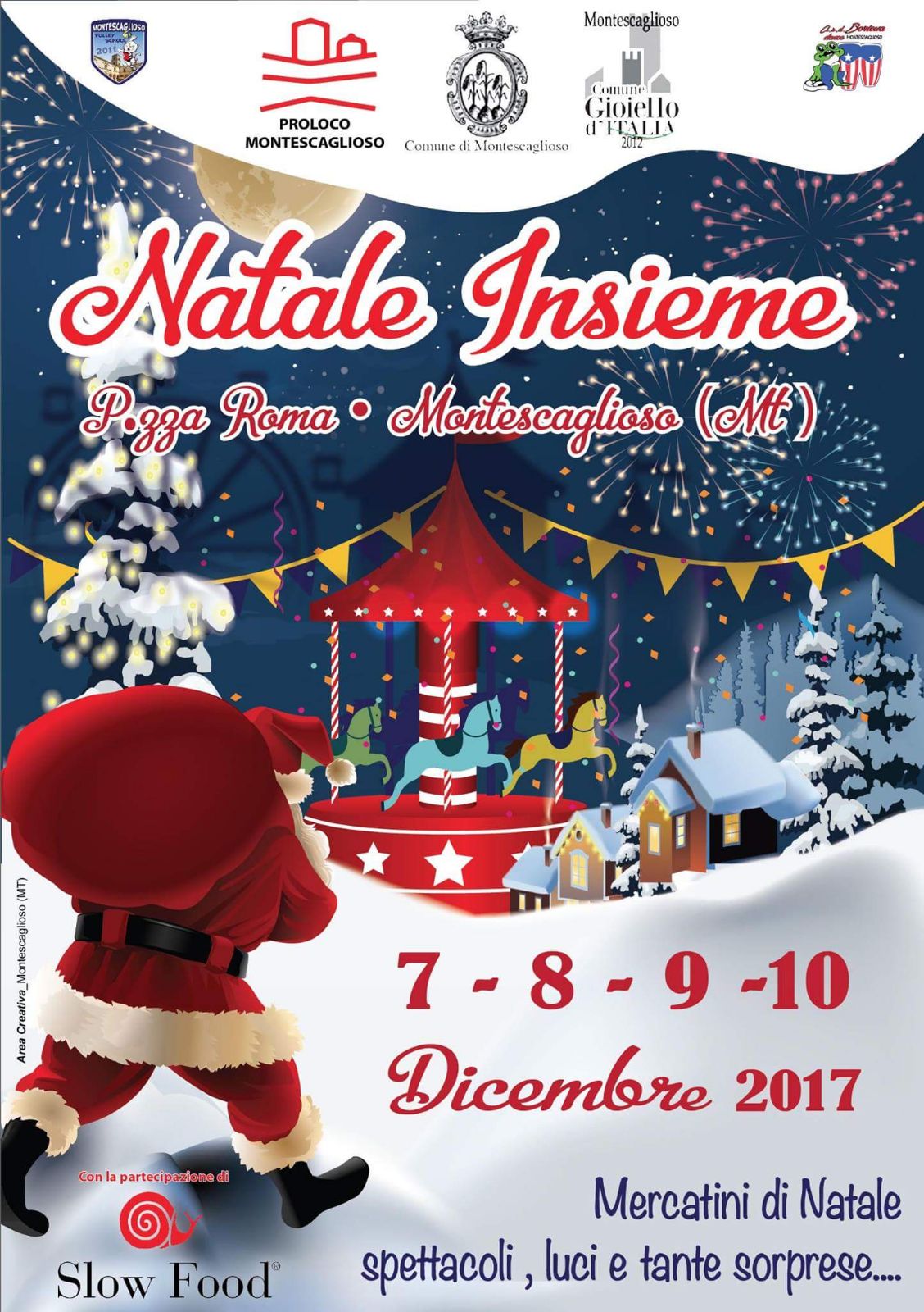 8 dicembre ore 10 – 13 e 19 – 23 mercatini di natale , evento sloow food i formaggi dell’Alleanza e tante sorprese.Inaugurazione casetta di babbo natale dell avis