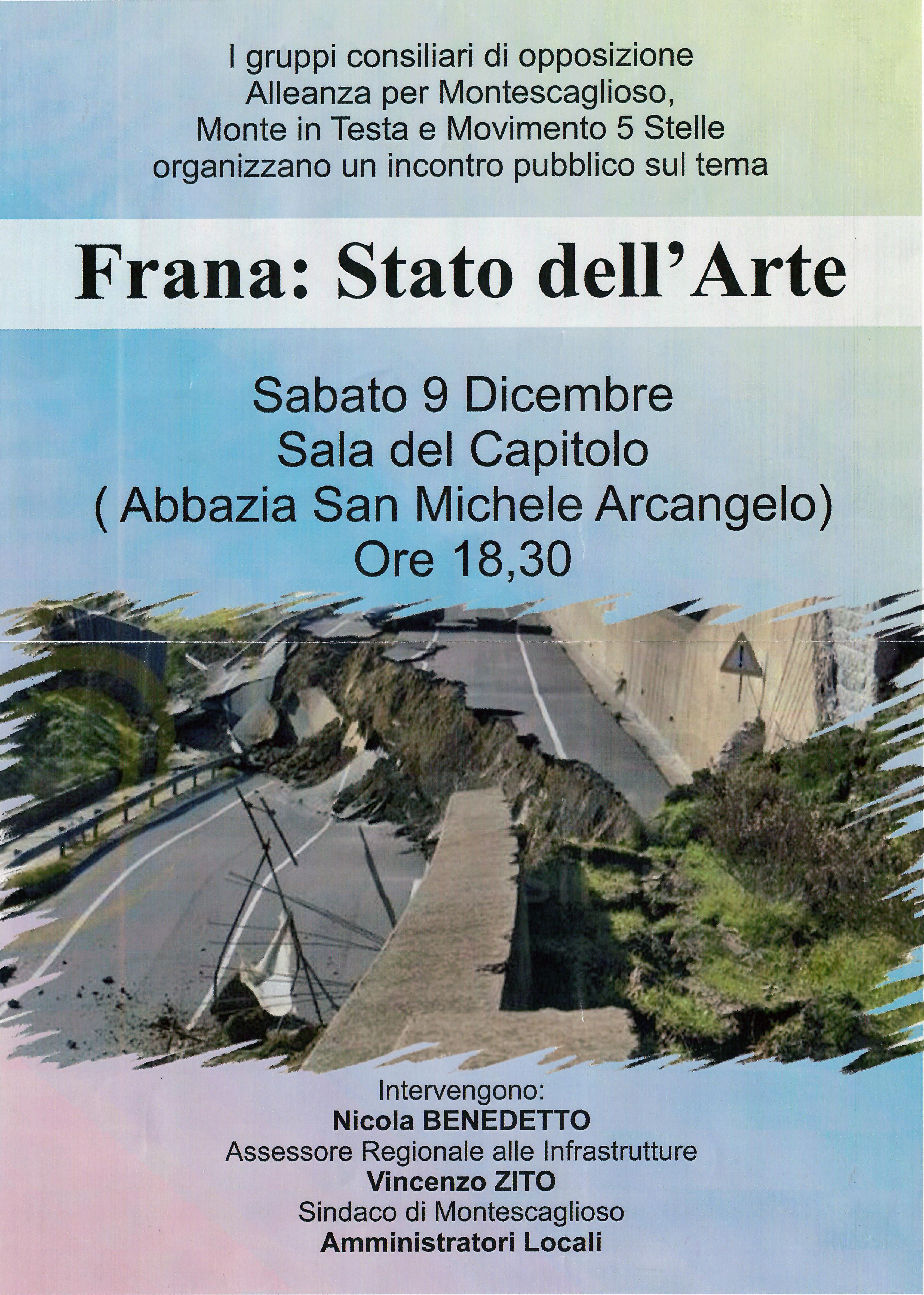 Lo stato dell’arte della Frana di Montescaglioso. sabato 9 dicembre 2017 nella sala del Capitolo dell’Abbazia San Michele Arcangelo di Montescaglioso alle ore 18:30. Ad organizzare l’incontro i gruppi consiliari di opposizione – Alleanza per Montescaglioso, Monte in Testa, Movimento 5 Stelle. Interverranno l’assessore alle infrastrutture della Regione Basilicata Nicola Benedetto, il Sindaco di Montescaglioso Vincenzo Zito e amministratori locali.