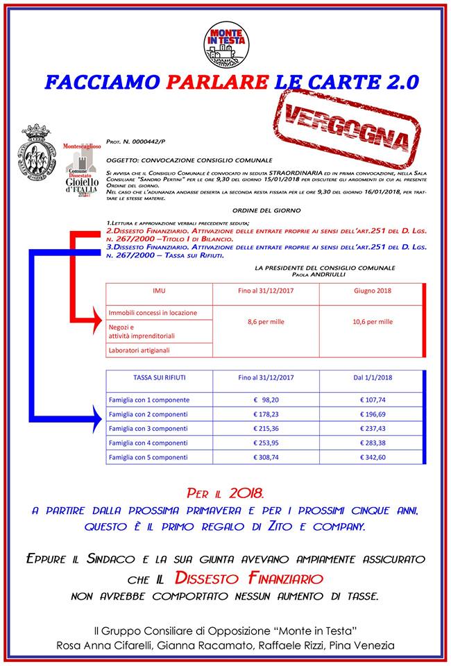 Per il 2018, a partire dalla prossima primavera e per i prossimi cinque anni, questo è il primo regalo della giunta Zito che ha dichiarato il dissesto finanziario alla comunità di Montescaglioso senza prima cercare un’alternativa