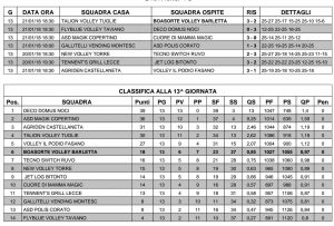 Sconfitta che fa male quella rimediata domenica sera in casa dal Gallitelli Vending Vis Severiana, che si e’ arreso al Corato penultimo della classe con il punteggio di 3-1. (22-25, 19-25, 25-14, 20-25). Un Corato che fino ad ora aveva vinto appena una partita e che con questo successo di platino aggancia proprio le montesi a quota 8 punti. La squadra allenata da Dino Esposito, pur rinforzatadal nuovo acquisto, Katia Patetta e dai ritorni di Roberta Calculli e Angelica Bovino, non ha disputato certo la sua miglior partita, comandando nel primo parziale fino al 21-17, ma subendo un break di 8-1 per via di alcuni errori veniali. Errori che si sono ripetuti in attacco e in battuta nel secondo set, mentre nella terza frazione e’ arrivata la rabbiosa reazione delle biancazzurre, che hanno approfittato anche del calo ospite. L’ equilibrio ha regnato nel terzo set, ma i soliti problemi di concentrazione e tenuta nei momenti decisivi hanno condannato le montesi alla sconfitta.《abbiamo disputato una gara al di sotto del nostro livello – spiega il Tecnico Esposito -. Da un lato eravamo per la prima volta con la squadra al completo, dopo un solo allenamento alle spalle, e qualche errore di troppo ci poteva anche stare, specie da chi non toccava palla da mesi; dall’altro le nostre avversarie avevano recuperato alcune atlete e hanno disputato una gran partita. Peccato, perche questa era una di quelle partite da vincere a tutti i costi, ed e’ arrivata proprio quando ci siamo rinforzati》. Bisogna comunque guardare avanti, e la sosta del campionato di domenica prossima servira’ proprio per raccogliere le idee e lavorare su cio’ che non va, se e’ vero che abbiamo vinto solo un set nelle ultime sette partite. In questo periodo di sosta – conclude Esposito – dovremo rivedere qualcosa, avere pazienza e lavorare in palestra per affinare le intese.