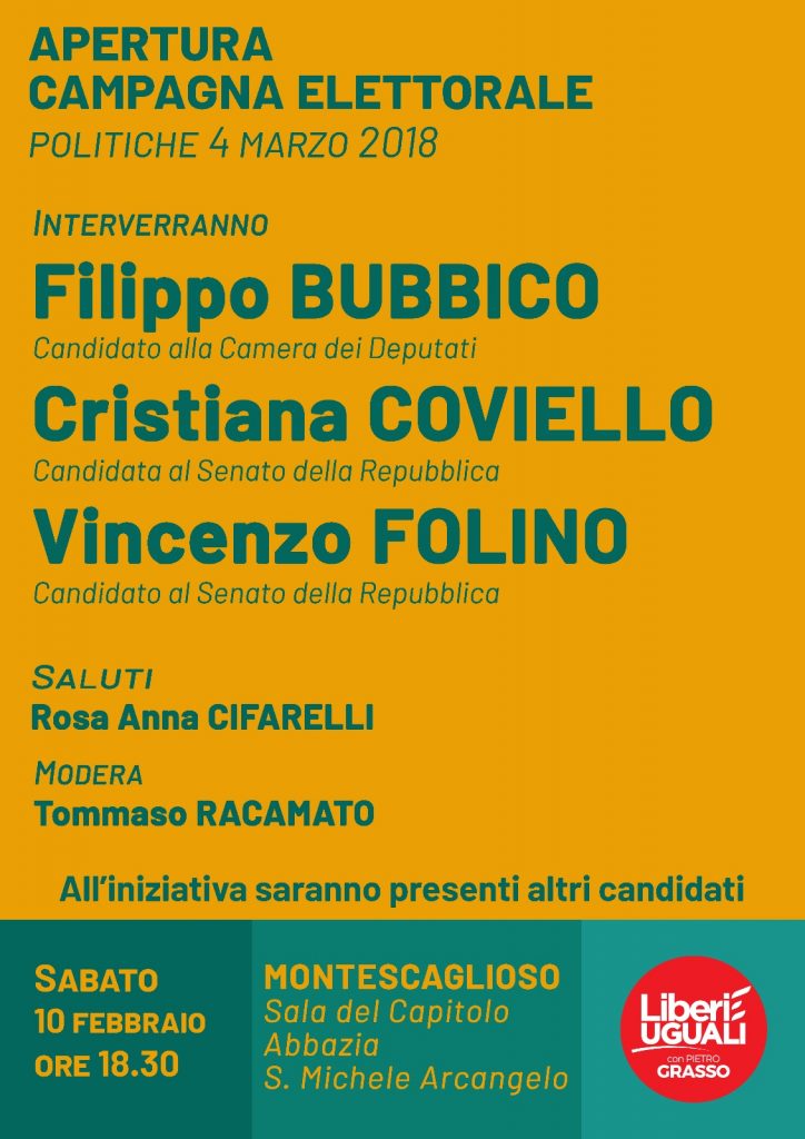Sabato 10 febbraio 2018, alle ore 18.30, presso la Sala del Capitolo dell’Abbazia di San Michele Arcangelo, la lista Liberi e Uguali aprirà la campagna elettorale a Montescaglioso (MT) per le Elezioni Politiche del 04 marzo 2018.