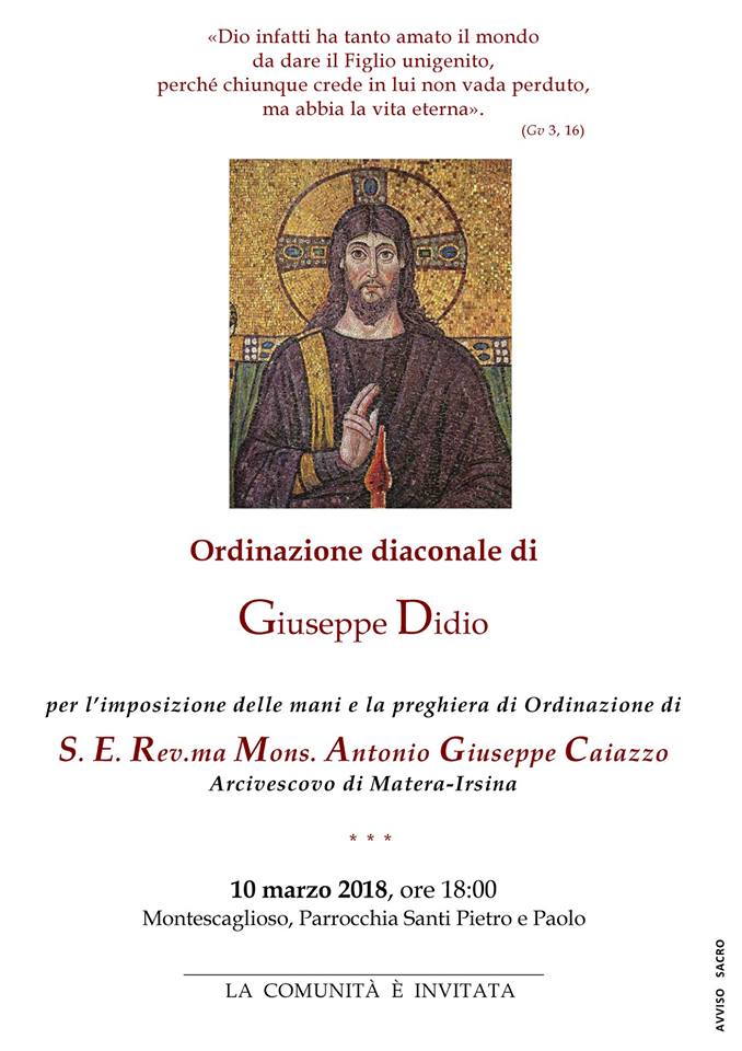 Montescaglioso, ordinazione diaconale di Giuseppe Didio Creato da Montescaglioso Data:05 Marzo 2018 in: Eventi, Persone Lascia un Commento 1907 Visualizzazioni
