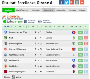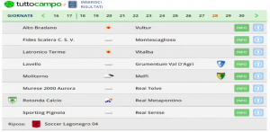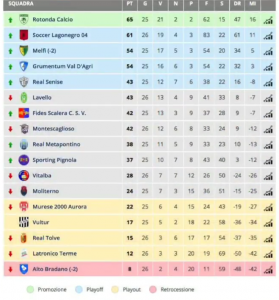 Tabellino 27° giornata: Montescaglioso- Rotonda 1-2 MONTESCAGLIOSO: Cifarelli A., Eletti, Varisco,Gambetta (44′ st. Palazzo),Giasi, Miraglia (34′ st. De Lucia),Natale, Di Cuia, Leccese, Grittani,Galetta(34′ st. Bitondo).All.:Martinelli ROTONDA: Barillaro, De Martino, Cossu,Gentile, Stilittano( 24′ st. Storino), Sacca, Santamaria, Cristallini ( 14′ st Scaglione), Sene’ (44′ st. Nunez), Ciranna, Frittita(14′ st. Alassani). All.:Pugliese Arbitro: Perillo di Napoli ( Chiarillo- Cappiello) Reti: 8′ st. Grittani (M) , 10′ st. rig. Ciranna, 26′ st Sene’ Note: Espulso Varisco (M) al 10′ st