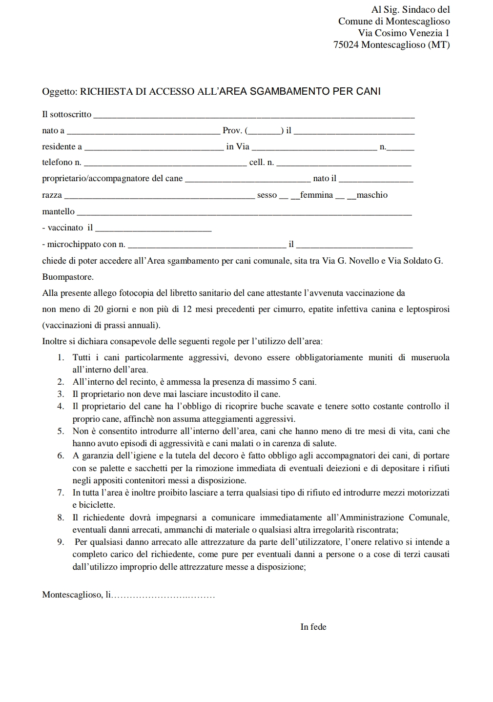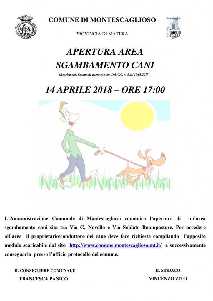Nel pomeriggio di sabato 14 aprile alle ore 17.00 sarà inaugurata l’area sgambamento ubicata tra Via Giuseppe Novello e Via Sold. Buompastore. Un importante parco, fortemente voluto dall’Amministrazione Comunale e dalla Consigliera Francesca Panico, che si rende necessario data la forte presenza nella nostra Città di animali a quattro zampe. Per accedervi, il proprietario o conduttore dal cane dovrà fare richiesta compilando l’apposito modulo scaricabile in allegato qui sotto o, sul sito internet www.comune.montescaglioso.mt.it oppure sulla pagina Facebook “Città di Montescaglioso” e successivamente consegnarlo all’Ufficio Protocollo del Comune.Si invitano i cittadini a tenere a cuore le sorti di un ulteriore bene pubblico ed a sentirsi tutti partecipi nel contribuirne alla sorveglianza. Si approfitta, inoltre, per ricordare che in tutto l’abitato è fatto d’obbligo per i proprietari degli animali la raccolta delle deiezioni degli stessi.