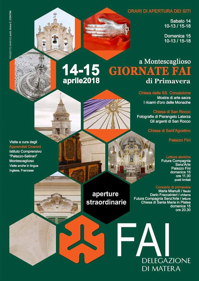 Tra le tante iniziative in programma nel prossimo weekend, particolare interesse assumono le oramai famose “Giornate Fai di Primavera” previste in data 14 e 15 aprile 2018. Grazie ai Volontari della Delegazione Fai di Matera, agli Apprendisti Ciceroni dell’Istituto Comprensivo Palazzo- Salinari di Montescaglioso ed ai componenti della Futura Compagnia Senz’Arte, saranno fruibili e visitabili gratuitamente alcuni beni culturali della nostra Città. In particolare, oltre alla millenaria Abbazia Benedettina di San Michele Arcangelo, saranno aperte al pubblico la Chiesa della SS. Concezione, la Chiesa di San Rocco, la Chiesa di Sant’Agostino e lo storico Palazzo Fini. A conclusione della due giorni, nella serata di domenica alle ore 20.30, presso la Chiesa di Santa Maria in Platea, Concerto di Primavera.