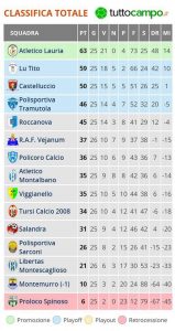 Nuova sconfitta per la Polisportiva da tempo salva, cade in casa per 3-1 al cospetto della capolista che ambisce alla vittoria del campionato. Una vittoria che proietta i laurioti sempre più verso la promozione quando mancano due giornate al termine e con quattro punti di vantaggio sul Tito. Un match deciso dalla tripletta di Olivieri con un piattone di destro al 35′ del primo tempo in dubbia posizione di off side e al 40′ con una zampata dopo un pasticcio difensivo del Montescaglioso. Nella prima frazione di gioco gli ospiti si rendono pericolosi diverse volte e alla mezzora colpiscono come detto.