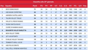 Nulla da fare per il Gallitelli Vending Vis Severiana, ora davvero ad un passo dal baratro della retrocessione diretta. Le ragazze allenate da Dino Esposito sono state sconfitte sul parquet di Bitonto con un secco 3-0, dicendo di fatto addio alla serie C; solo la matematica, infatti, concede ancora qualche residua speranza al sestetto montese, che avrebbe bisogno di un autentico miracoloper evitare uno degli ultimi due posti. In terra pugliese, c’e’ comunque stata battaglia, a dispetto di quanto non dica il punteggio finale. Le biancazzurre hanno dato vita ad un elettrizzante testa a testa con le bitontine, che sono riuscite ad aggiudicarsi il primo parziale solo ai vantaggi sul 31-29, piegando la strenua resistenza di un Montescaglioso per lunghi tratti vicinissimo allo 0-1. L’ equilibrio non e’ mancato nella seconda frazione, che pero’ ha visto le padrone di casa meno fallose nel finale e vittoriose sul 25-20. Ma la squadra di Esposito, pur sotto di due set, non si e’arresa, continuando a lottare palla su palla e cedendo anche nel terzo set solo nei finali con il parziale di 25-22. Una sconfitta che fa male, non tanto per la prestazione, nel complesso positiva, quanto per gli scenari impietosi che si prospettano dinanzina al sestetto montese, sempre desolatamente ultimo della classe con 12 punti, due in meno del Corato e ben cinque in meno del Lecce ( dopo che Bitonto e Taviano con le loro vittorie sono scappate, e quindi irrangiungibili). Per agganciare il Lecce, che oggi disputerebbe i play out, le biancazzurre ora dovrebbero vincere entrambe le sfide rimaste ( Fasano in casa e a Corato all’ultima) e sperare in due sconfitte delle salentine, e naturalmente che anche il Corato non faccia punti. Una serie di combinazioni difficilissime, ma con le montesi che avranno il dovere di provarci.