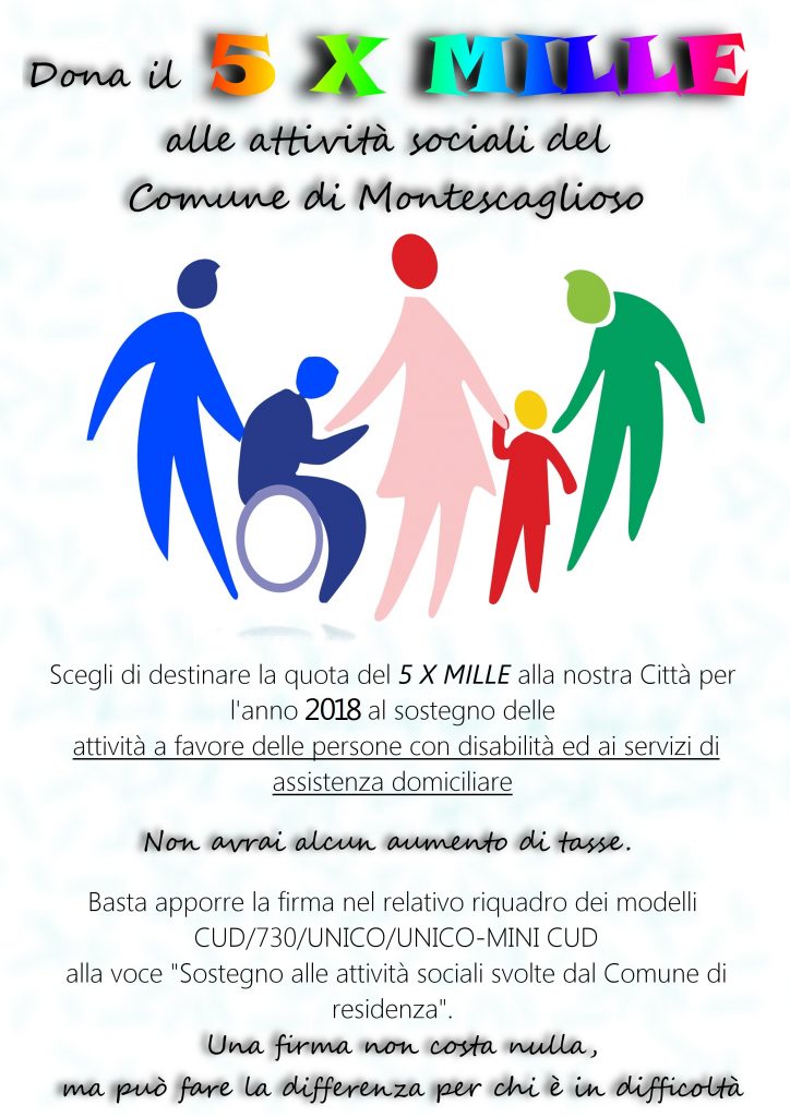 Anche per l’anno 2018 sarà possibile devolvere la quota del 5×1000 alla Città di Montescaglioso per le attività a sostegno delle persone con disabilità ed ai servizi di assistenza domiciliare. Questa possibilità, fortemente voluta dall’Assessore Francesca Fortunato, non è una tassa aggiuntiva e non è un’alternativa all’ 8×1000. Per destinare il 5×1000 al proprio Comune di residenza è sufficiente apporre la propria firma nel relativo riquadro dei modelli CUD/730/UNICO/UNICO-MINI CUD alla voce “Sostegno alle attività sociali svolte dal Comune di residenza”.