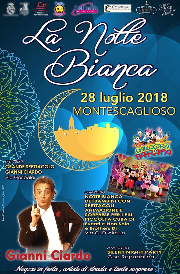 Importante appuntamento sabato 28 luglio con la terza edizione de “La Notte Bianca” che vedrà tantissime attività dislocate in più parti della Città: in Via Carlo D’Alessio dalle ore 20.30 giochi e spettacoli per bambini, in Via Garibaldi alle ore 22.30 spettacolo di cabaret con il comico pugliese Gianni Ciardo, a seguire (ore 0.30) in Corso Repubblica Silent Disco Night.