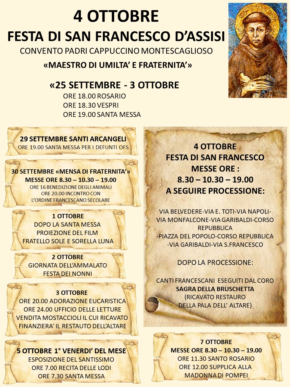 S.Francesco D’Assisi Convento Frati Cappuccini Montescaglioso, Programma religioso dal 25 settembre al 7 ottobre