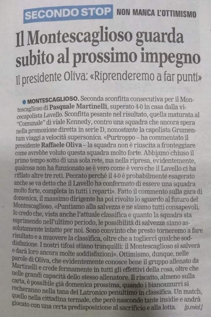 Il Montescaglioso guarda subito al prossimo impegno Creato da rafa85 Data:01 Marzo 2019 in: Varie Lascia un Commento 745 Visualizzazioni Presidente Raffaele Oliva