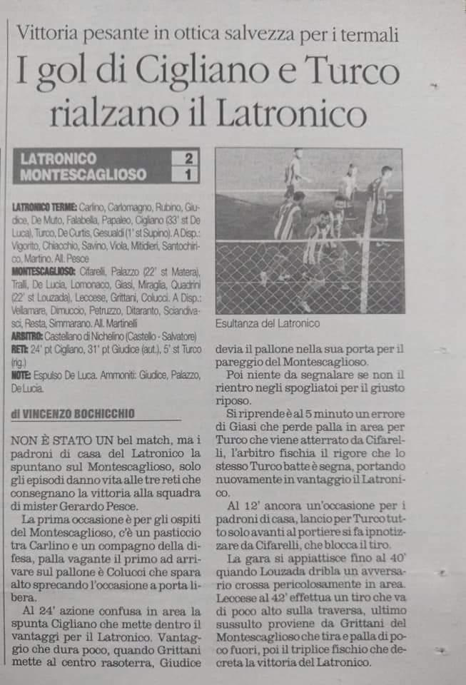 Latronico:Carlino,Carlomagno,Rubino,Giudice, De Muto,Falabella,Papaleo,Cigliano ( 33′ s.t. De Luca),Turco,De Curtis,Gesualdi ( 1′ s.t. Supino). A disp. Vigorito,Chiacchio, Supino,Savino, De Luca,Viola, Mitidieri, Santochirico, Martino. All.Pesce