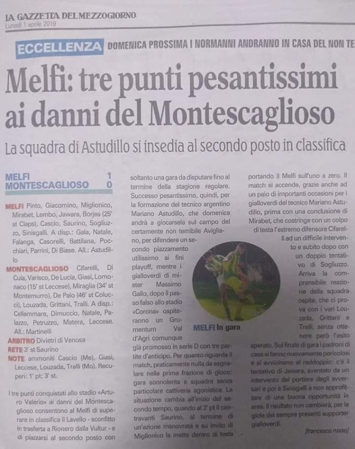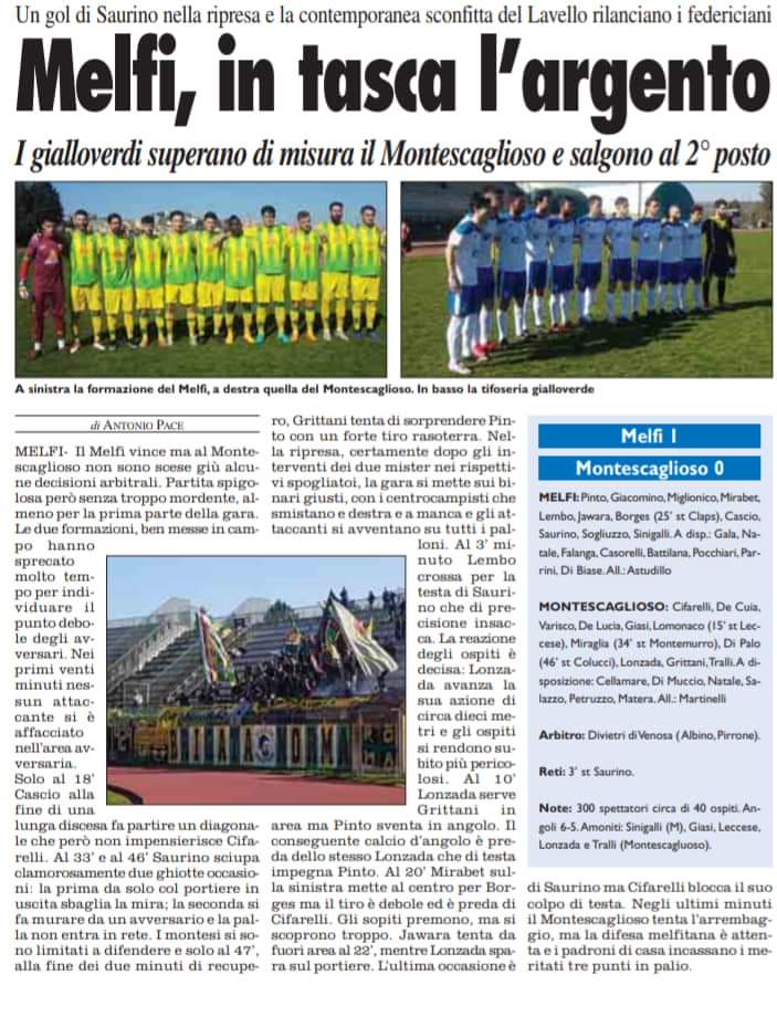 Montescaglioso sconfitto a Melfi Creato da rafa85 Data:03 Aprile 2019 in: Varie Lascia un Commento 898 Visualizzazioni L’undici montese sceso in campo all’Arturo Valerio di Melfi I supporters Montesi a Melfi