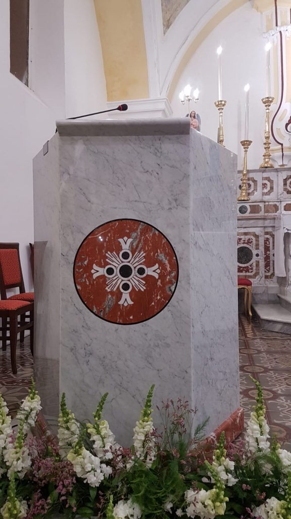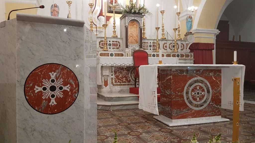 . L’ambone e l’altare sono in marmo policromo e presentano i medesimi e lementi figurativi presenti sull’altare maggiore, con la presenza di motivi ornamentali.