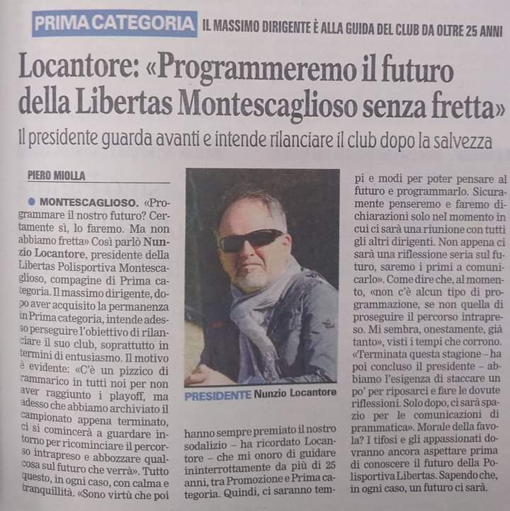 Programmare il nostro futuro ? Certamente sì , lo faremo. Ma non abbiamo fretta. Così parlò Nunzio Locantore presidente della Polisportiva Montescaglioso, compagine di Prima categoria . Il massimo dirigente,dopo aver acquisito la permanenza in prima categoria intende adesso perseguire l’obbiettivo di rilanciare il suo club in termini anche d’entusiasmo. Il motivo è evidente: C’è un pizzico di rammarico per non aver raggiunto i play off , ci si comincia già a guardare attorno , per ricominciare il percorso intrapreso ed abbozzare qualcosa sul futuro che verrà. In casa Polisportiva Montescaglioso però si predica calma e tranquillità che poi ha sempre premiato il sodalizio montese che guida ininterrottamente da più di venticinque anni tra promozione e prima categoria dunque ci saranno tempi e modi per poter programmare il futuro, così come ha dichiarato il presidente Nunzio Locantore . Sicuramente penseremo e faremo dichiarazioni se non nel momento in cui – ha affermato il presidente ci sarà una riunione con i dirigenti. Non appena ci sarà una riflessione seria sul futuro saremo in primi a comunicarlo . Al momento non c’è alcun tipo di programmazione se non quello di proseguire il percorso intrapreso che e già molto. Terminiamo questa stagione dopodiché stacchiamo un po’ . Ha concluso il presidente Nunzio Locantore per riposarci e dopo fare le dovute comunicazioni. Dunque bisognerà ancora aspettare. Prima di conoscere il futuro della Polisportiva.