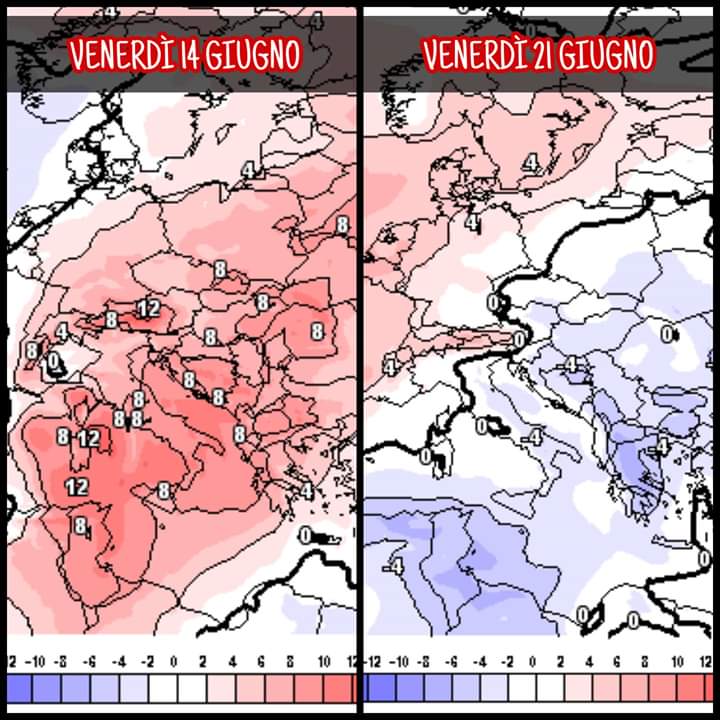 Nell’immagine sottostante sì nota un confronto tra gli scarti rispetto alla norma (in rosso temperature sopra media e in blu temperature in media) tra venerdì 14 giugno e venerdì 21 giugno. Si nota chiaramente come passeremo da temperature fino a 8/10°C sopra la media a temperature anche di 4°C sotto la media, per un salto complessivo pari a 12/14°C.