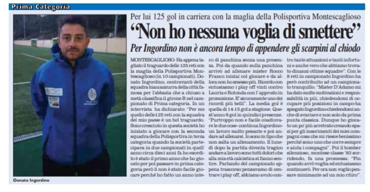Ha appena tagliato il traguardo delle 125 reti con la maglia della Polisportiva Montescaglioso (in 10 campionati ). Donato Ingordino , centravanti della squadra biancazzurra della città famosa per l’abbazia che a chiuso a metà classifica il girone B nel campionato di Prima categoria. In un intervista ha dichiarato-. Per me quello delle 125 reti con la squadra del mio paese è un bel traguardo. Sono cresciuto in questa società ho iniziato a giocare con la seconda squadra della Polisportiva in terza categoria quando la società partecipava in due campionati in quell’anno circa dieci anni fa ho esordito è stato il primo anno che ho giocato per poi passare in prima categoria però li non è stato facileperché ho fatto un anno intero di panchina senza una presenza,poi da quando sulla panchina arrivo ad allenare mister Rocco Franco iniziai col giocare e da allora non ho smesso più .Sicuramente la media gol e quella di 14/15 gol a stagione.Quest’anno 8 gol in quindici presenze. Purtroppo non e facile coadiuvare le due cose un lavoro molto pesante e poi andare ad allenarsi poi io sono in tipo che non salta un allenamento. Il lunedì dopo la partita diventa tragico andare a lavoro sono tutti dolori che alla mia età calcistica si fanno sentire . Parlando del campionato appena trascorso pensavamo di centrare i play off , abbiamo avuto contro tante situazioni e tanti infortuni e anche vero che abbiamo trovato dinanzi ottime squadre . Con le 8 reti Ingordino ha però contribuito ad un campionato tranquillo. Mister D’Adamo mi ha dato molte motivazioni e responsabilità in piu’oltre alle mie chiedendomi di occupare più posizioni in campo – ha spiegato Ingordino- chiedendomi anche di svariare e non solo da prima punta classica. Dunque ho giocato un po’ più arretrato creando spazi per gli inserimenti dei miei compagni cosa che mi riesce benissimo perché sono uno che corre sempre . Poi il bomber silenzioso montese classe 83 sorridendo ci fa una promessa fin quando avrò voglia ed entusiasmo continuerò . Per ora non voglio pensare minimante ad un mio ritiro.