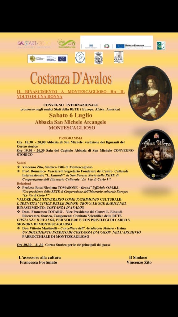 Nella giornata di sabato 6 luglio alle ore 18.30 presso l’Abbazia di San Michele Arcangelo è stato organizzato dall’Assessore Francesca Fortunato, di concerto con il Centro Culturale Internazionale Luigi Einaudi, un convegno, relativo a Costanza D’Avalos, Signora di Montescaglioso.