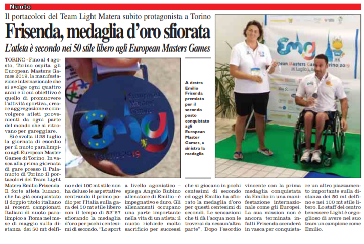 quello di promuovere l’attività sportiva, creare aggregazione e coinvolgere atleti provenienti da ogni parte del mondo che si ritrovano per gareggiare. Si è svolta il 28 luglio la giornata di esordio per il nuoto paralimpico agli European Master Games di Torino. In vasca alla prima giornata di gare presso il Palanuoto di Torino il portacolori del Team Light Matera Emilio Frisenda. Il forte atleta lucano,che ha già conquistato il doppio titolo italiano ai recenti campionati Italiani di nuoto paralimpico a Roma nel mese di maggio sulla distanza dei 50 mt delfino e dei 100 mt stile non ha deluso le aspettative centrando il primo podio per l’Italia sulla gara dei 50 mt stile libero con il tempo di 52”67 sfiorando la medaglia d’oro per pochi centesimi di secondo. “Lo sport a livello agonistico spiega Angelo Rubino allenatore di Emilio – èimpegnativo e duro. Gli allenamenti occupano una parte importante nella vita di un atleta: il nuoto richiede molto sacrificio per successi che si giocano in pochi centesimi di secondo ed oggi Emilio ha sfiorato la medaglia d’oro per questi centesimi di secondi. Le sensazioni che ti dà l’acqua non le troverai da nessun’altra