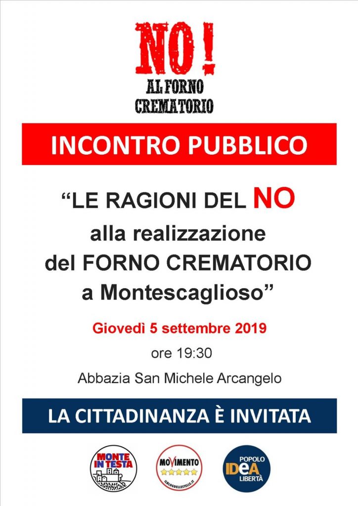 No al Forno Crematorio pubblico incontro Creato da Montescaglioso Data:04 Settembre 2019 in: Ambiente, Persone, Politica, Salute Lascia un Commento 1158 Visualizzazioni