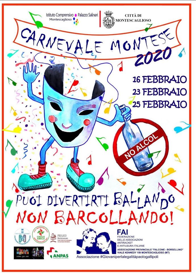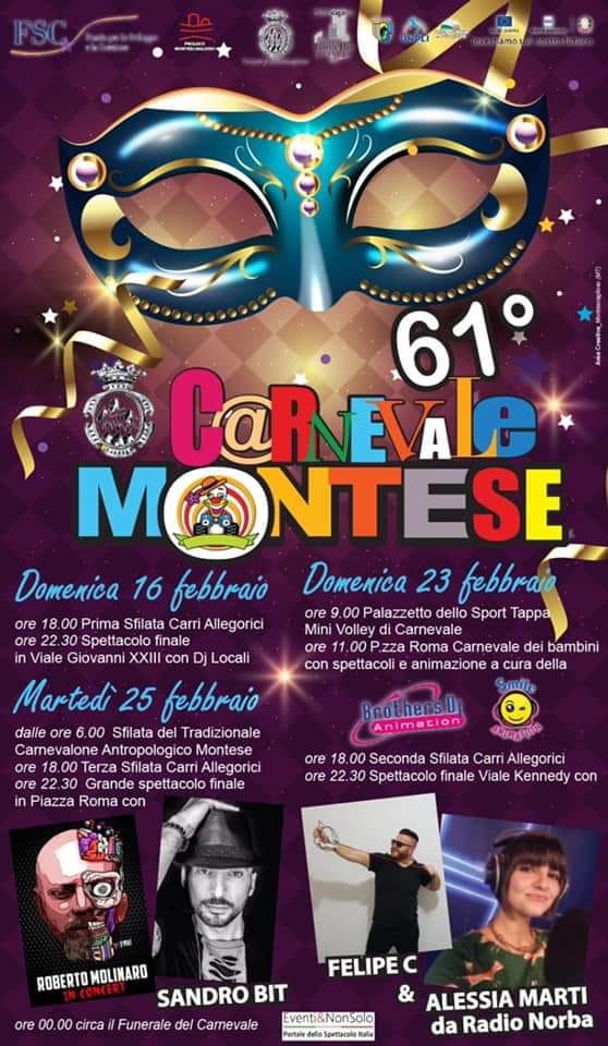 Come oramai consuetudine e tradizione, si è definito in questi giorni il programma dell’edizione del Carnevale Montese 2020. Un grandissimo evento che dà lustro alla nostra Città e che ha visto il Vice Sindaco Rocco Oliva particolarmente impegnato per garantire la buona riuscita della manifestazione in collaborazione con l’Assessore Francesca Fortunato ed il Consigliere Pietro Buonsanti, l’Arma dei Carabinieri, il Comando di Polizia Municipale, le Associazioni di Protezione Civile Anpas e Croce Amica, la Pro Loco ed il Circolo Arci La Lampa. Anche quest’anno sono confermate tre date ed importanti ospiti che attireranno a Montescaglioso numerosi ospiti dai paesi limitrofi. Data iniziale domenica 16 febbraio con la sfilata dei Carri Allegorici e spettacolo finale previsto per le ore 22.30 in Viale Giovanni XXIII con Dj locali. Secondo appuntamento domenica 23 febbraio: in mattinata spettacoli vari ed intrattenimento per i più piccini presso il Palazzetto dello Sport e Piazza Roma, dal pomeriggio sfilata ed a seguire spettacolo in Viale Kennedy con Felipe C ed Alessia Marti di Radionorba. Giornata conclusiva, la più attesa, martedì 25 febbraio. Centinaia di partecipanti dalle prime ore dell’alba daranno vita al Carnevalone Tradizionale rientrante nella “Rete dei Carnevali Lucani e maschere della Lucania a valenza antropologica e culturale” costituita dagli otto carnevali storici lucani, riconosciuti dalla Regione come “patrimonio immateriale”, ovvero: Montescaglioso, Teana, Satriano, Tricarico, Cirigliano, Aliano, San Mauro Forte e Lavello. Nel pomeriggio parata dei Carri Allegorici e gran finale in Piazza Roma con Roberto Molinaro e Sandro Bit in consolle.