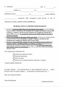 autodichiarazioni in caso di spostamenti che contiene una nuova voce con la quale l’interessato deve autodichiarare di non trovarsi nelle condizioni previste dall’art. 1, comma 1, lett. c) del D.P.C.M. 8 marzo 2020 che reca un divieto assoluto di mobilità dalla propria abitazione o dimora per i soggetti sottoposti alla misura della quarantena ovvero risultati positivi al virus “COVID-19”.