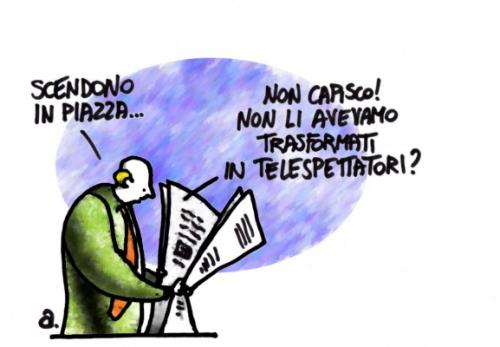 Quanto ai bambini presenti nei cortei, volevo semplicemente farti riflettere sul fatto che gli insegnanti per portare fuori gli allievi per uscite didattiche o gite devono avere l’autorizzazione dei genitori. A manifestazioni sindacali o politiche i bambini non possono andarci se non accompagnati dai genitori o da un loro delegato. Se i bambini sono manipolati e strumentalizzati, lo sono con la partecipazione attiva dei genitori. Avranno i genitori il diritto a “manipolare” i figli o possono farlo con i figli degli altri soltanto gli spot “Giochi preziosi” delle televisioni commerciali?