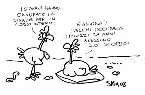 Sono pienamente d’accordo con Jacobsen sulla natura di certi stagionati rappresentanti degli studenti che in questi giorni hanno guadagnato la scena mediatica. Credo anzi che non siano semplicemente i lacchè dei tradizionali baroni, ma personaggi attivati dal governo per fare controinformazione. Forse elementi della “formula” Cossiga per far tornare l’ordine.