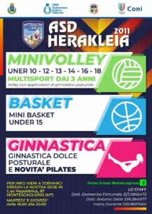 E’ il momento di ripartire per l’Herakleia che annovera tra gli altri una scuola mini volley , under 10-12-14-16-18 mini basket e under 15banche attività di ginnastica posturale,ginnastica dolce e novità Pilates. La nuova stagione, che partirà nel post covid, sarà l’anno zero. In seguito alle difficoltà che si sono verificate. La società di Antonio Delia farà ripartire con un progetto che parta dal basso, che metterà al centro come sempre il settore giovanile che sarà affidato a tecnici preparati.