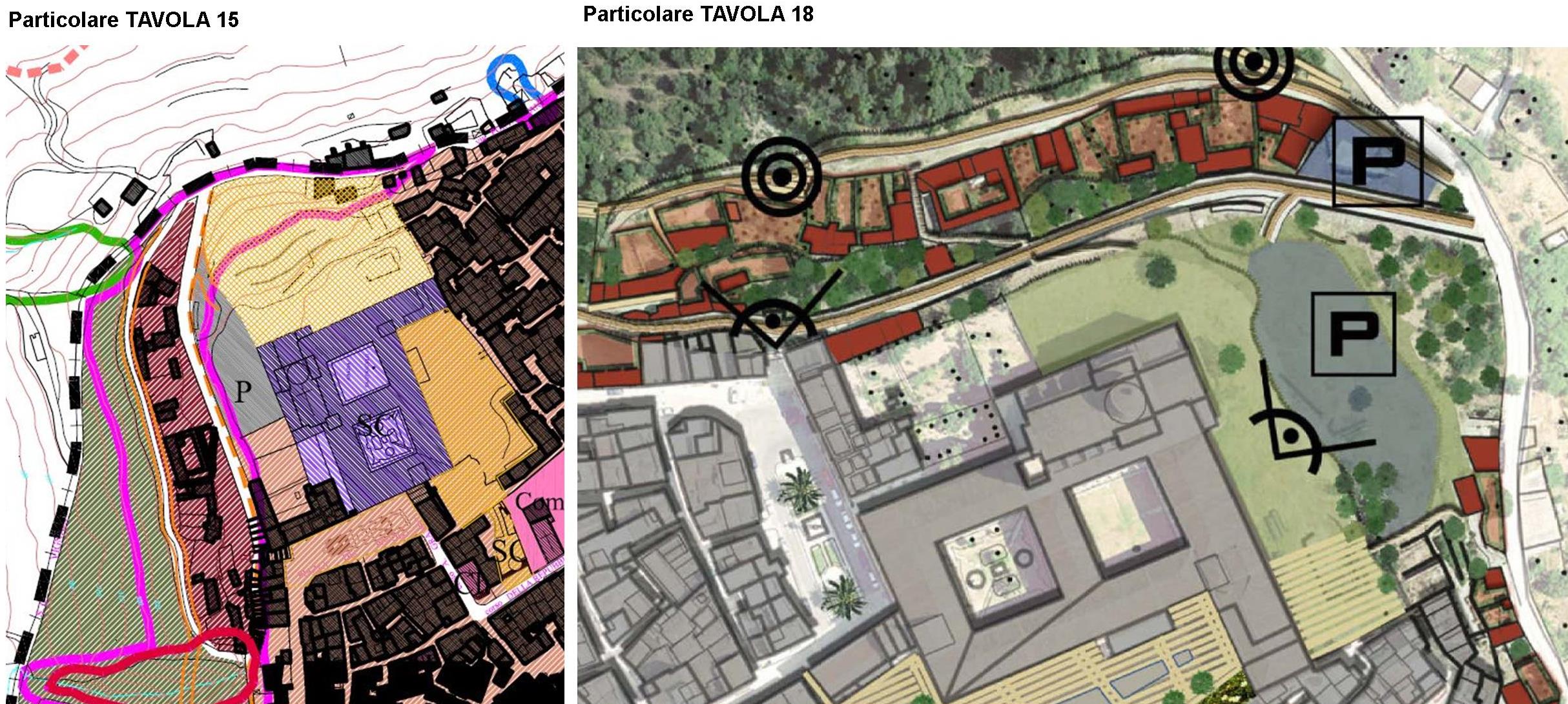 Nella tavola n. 15 (Sintesi di Progetto, Regimi Urbanistici) il parcheggio del PALLONE è collocato tra le mura medievali superstiti e la chiesa. Questa soluzione determina lo sviluppo del parcheggio su due cavità: la cantina rupestre e la galleria di collegamento tra questa e la cantina superiore del monastero.