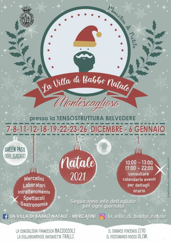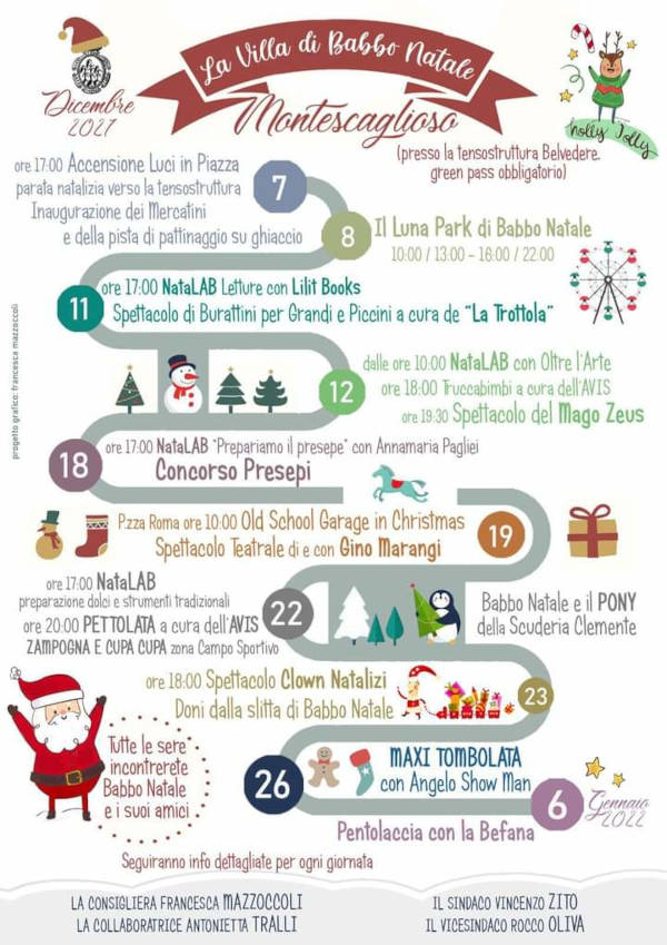 - L’11 dicembre il primo “NataLAB”, sono stati soprannominati così i Laboratori di intrattenimento nella Villa di Babbo Natale. Il primo è dedicato alle Letture grazie alla Lilit Books, casa editrice montese guidata fa Pippo Bellone, e a seguire si potrà assistere allo spettacolo di Burattini per Grandi e Piccini a cura de “La Trottola”.