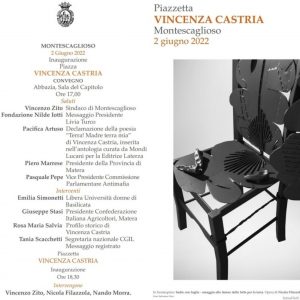 Giovedì 2 giugno 2022 alle ore 17 nell’abbazia ci sarà un convegno sulla figura e il ruolo di VINCENZA CASTRIA nelle lotte per l’emancipazione delle donne e delle genti meridionali. L’Amministrazione comunale, in occasione del 70 anniversario delle lotte contadine, su proposta della segretaria nazionale della CGIL Ivana Galli decise di intitolare un luogo a Vincenza, cosa che avviene in occasione del 100 anno della sua nascita. La data scelta é altamente simbolica, oltre ad essere la Festa della Repubblica Italiana, é fondamentale PER TUTTE LE DONNE che nel 1946 conquistarono il diritto al voto.