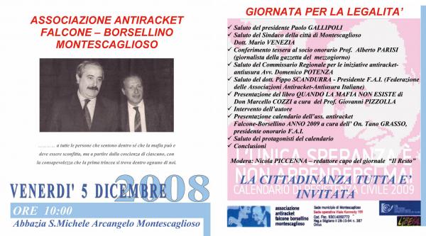 Complimenti all’associazione per l’iniziativa di invitare Tano Grasso a Montescaglioso, un’occasione per promuovere la legalità. E’ il fratello di Libero Grassi imprenditore siciliano ucciso per essersi rifiutato di pagare il pizzo ed è presidente della federazione italiana antiracket.