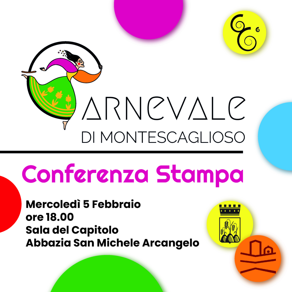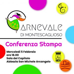 Il Carnevale di Montescaglioso verrà ufficialmente presentato con una conferenza stampa prevista per mercoledì 5 febbraio, alle ore 18:00, presso l’Abbazia di San Michele Arcangelo nella Sala Capitolo.