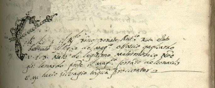 L’atto di battesimo di Giovan Leonardo Gagliardo arricchito da fregi.