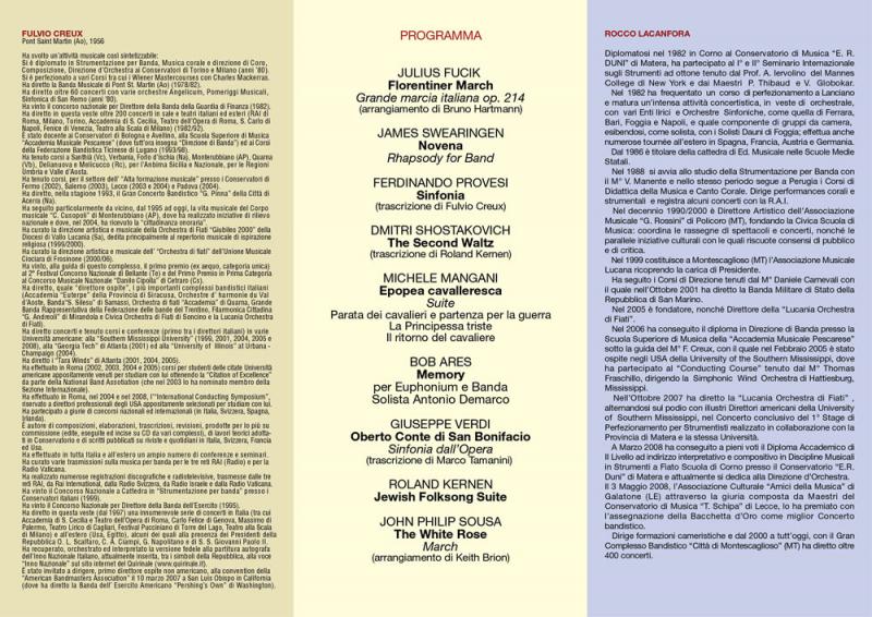 L’A.M.L. (Associazione Musicale Lucana), nell’ambito dei festeggiamenti del decennale della sua fondazione è onorata di presentare il CONCERTO DI PRIMAVERA della "Lucania Orchestra di Fiati " che si terrà a Matera Sabato 04 Aprile 2009 c/o Auditorium del Conservatorio di Musica ore 20,30.